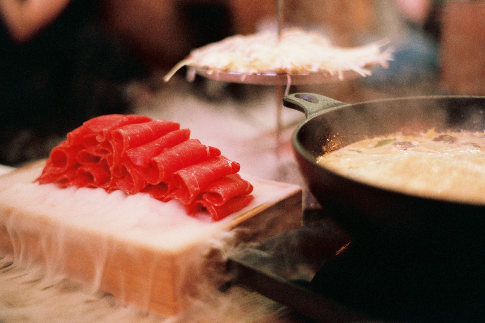 Rindfleisch dünn geschnitten wird in heisser Brühe gegart. Dazu reichen wir 4 verschiedene Saucen, Pommes / Bratkartoffeln / Rosmarinkartoffeln, Mixed Pickels. Später reichen wir Ihnen die Brühe mit hausgemachten Flädli.